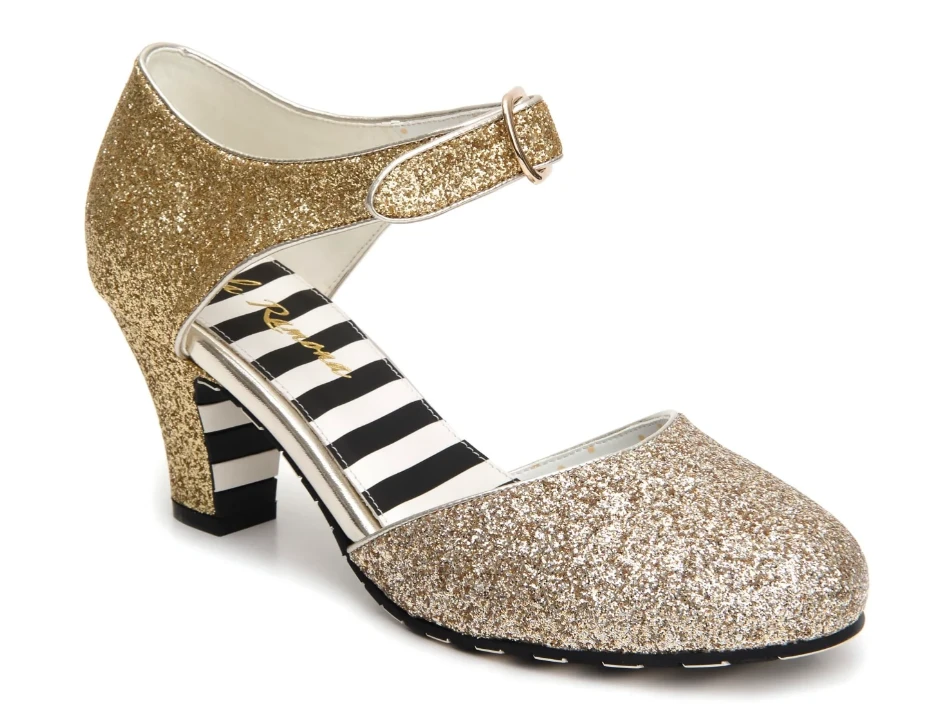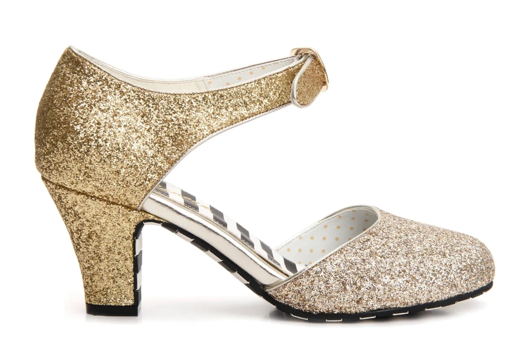 These gorgeous two toned gold glitter shoes will add a touch of sparkle to any outfit. It’s a fantastic heel height and in footbed it beautifully cushioned for maximum comfort!