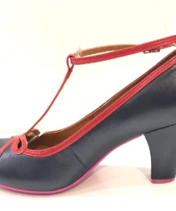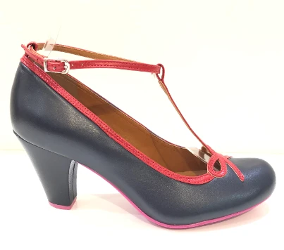 This delightful vintage inspired heel by Cristofoli will be an investment staple in your wardrobe. It is in a versatile navy blue leather and is trimmed with a contrasting red leather. It has an adjustable ankle strap with t-bar and a sweet delicate bow embelishment on the toe