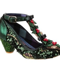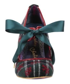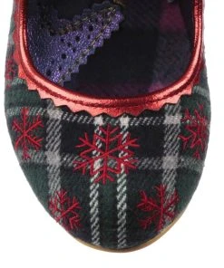 Wrap yourself in these winter wonders! Traditional green and white tartan is embroidered with metallic red snowflakes and matching piped zigzag edging, finished with a wearable black heel and green ribbon lace. Add these to your wardrobe this season!